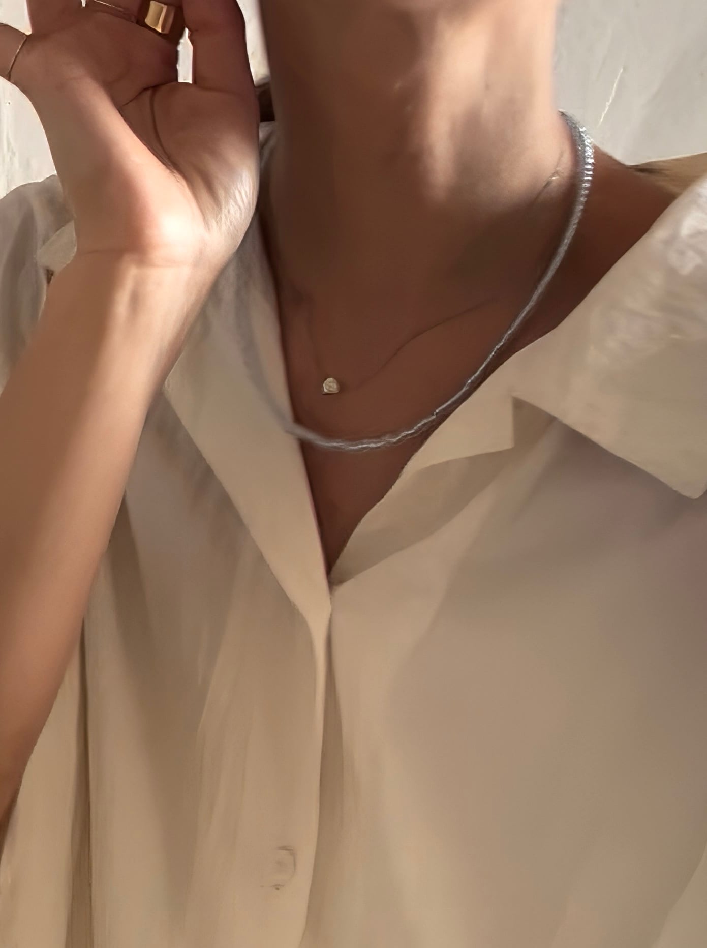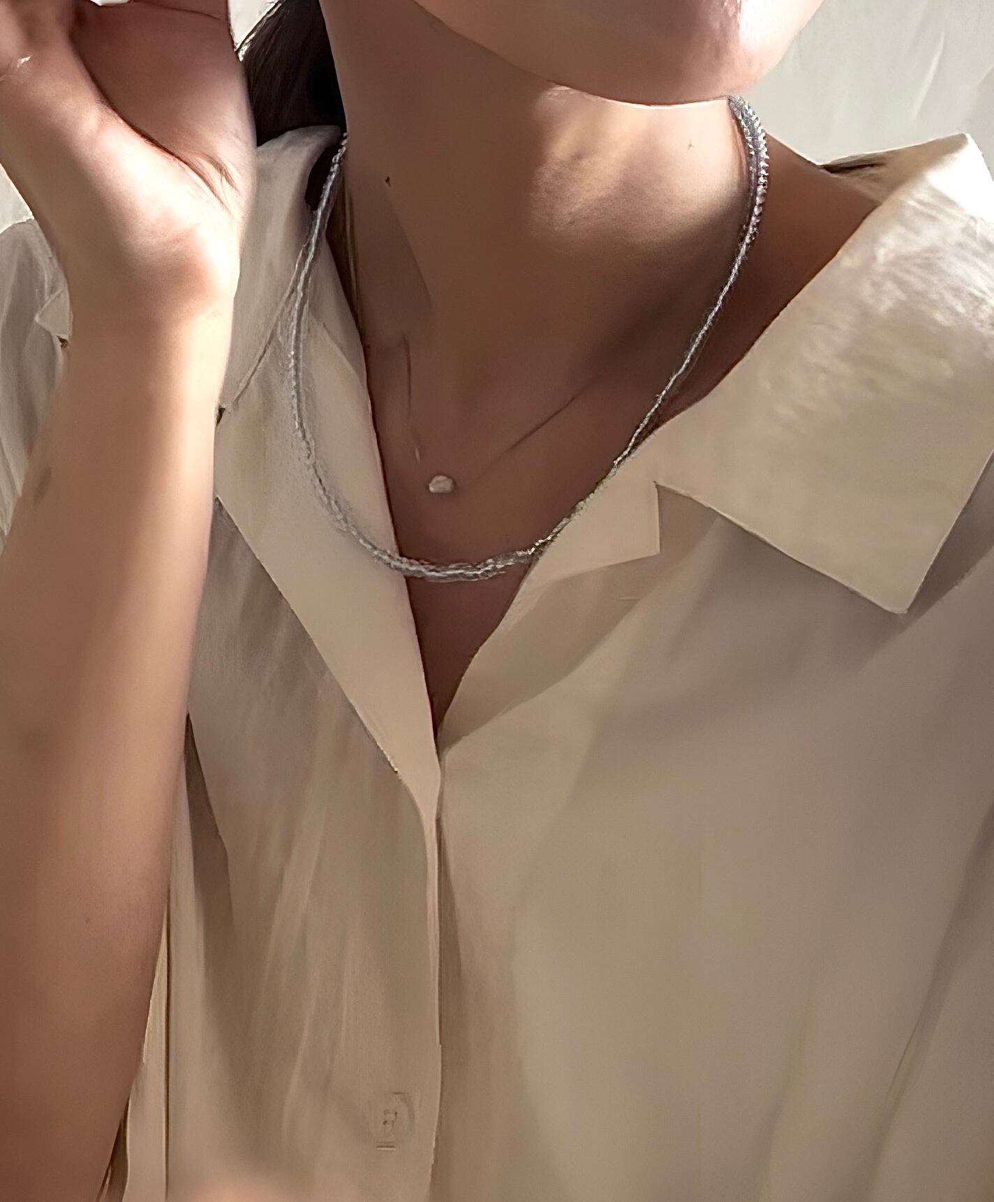 クリアな中にほんのり水色の、爽やかなビーズnecklace。一部分だけモードな存在感のあるsilver925チェーンを配置して抜け感を加えました。