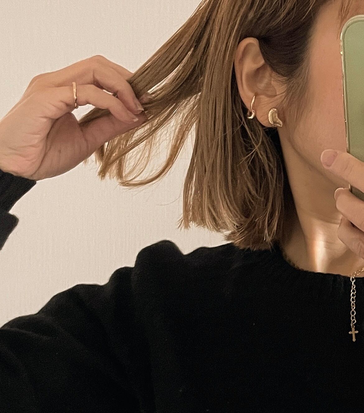 丸みのあるピアスやイヤカフなどと重ねづけする事で